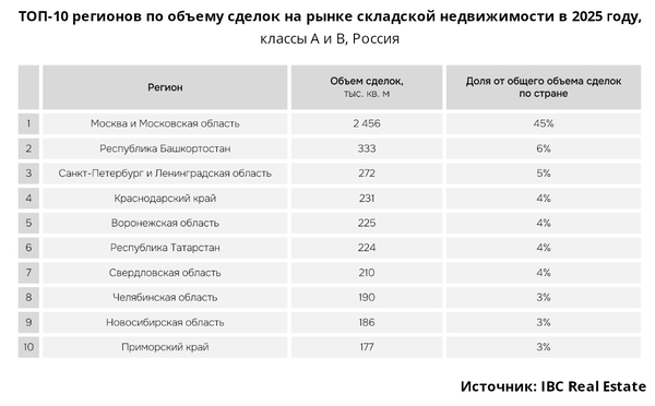 За последние годы регион Санкт-Петербурга и ЛО традиционно был вторым после Московского и становился обладателем «бронзы» лишь в 2015 году, когда на второе место поднялась Свердловская область. Однако по итогам 2025 года на второе место по объему сделок со складами вышел Башкортостан (333 тыс. кв. м), а Санкт-Петербург с результатом 272 тыс. кв. м переместился на третье. Лидирует по объему сделок Московский регион с показателем в 2,5 млн кв. м.