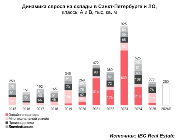 По данным консалтинговой компании IBC Real Estate, спрос на складскую недвижимость в России по итогам 2025 года составил 5,5 млн кв. м, что на 8% ниже результата 2024 года. Доля сделок со складской недвижимостью в Санкт-Петербурге и ЛО составила 5% от общего объема по стране или 272 тыс. кв. м. Это третье место по распределению спроса на складскую недвижимость среди регионов России.
