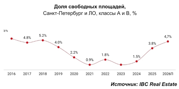 Доля вакантных площадей в Санкт-Петербурге и ЛО на конец 2025 года составила 3,8%, увеличившись за год на 2,3 п.п. Этому способствовали замедление деловой активности и постепенное возвращение рынка к норме после ажиотажного спроса 2023-2024 гг. 43% от общего объема вакантных площадей составили опции, освобожденные онлайн-операторами и предлагаемые как в аренду, так и в субаренду.